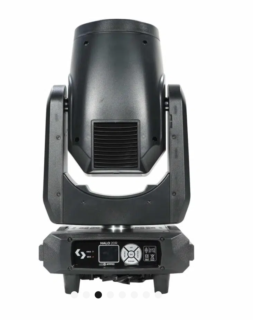 Halo 20R es un cabezal móvil tipo beam de alto rendimiento equipado con una lámpara de 380W y un ángulo de haz extremadamente definido de 1.8°. Halo 20R es capaz de lograr un flujo lumínico de 580.000 Lux @ 10M. Su sistema posee una rueda de 14 colores, 13 gobos fijos, foco y dimmer, además de filtro frost y estrobo de alta velocidad. Halo 20R incorpora una rueda independiente de efectos de color y un sistema de doble prisma (8 y 24 caras) que puede combinarse para generar texturas complejas y dinámicas. Protocolo RDM ready.